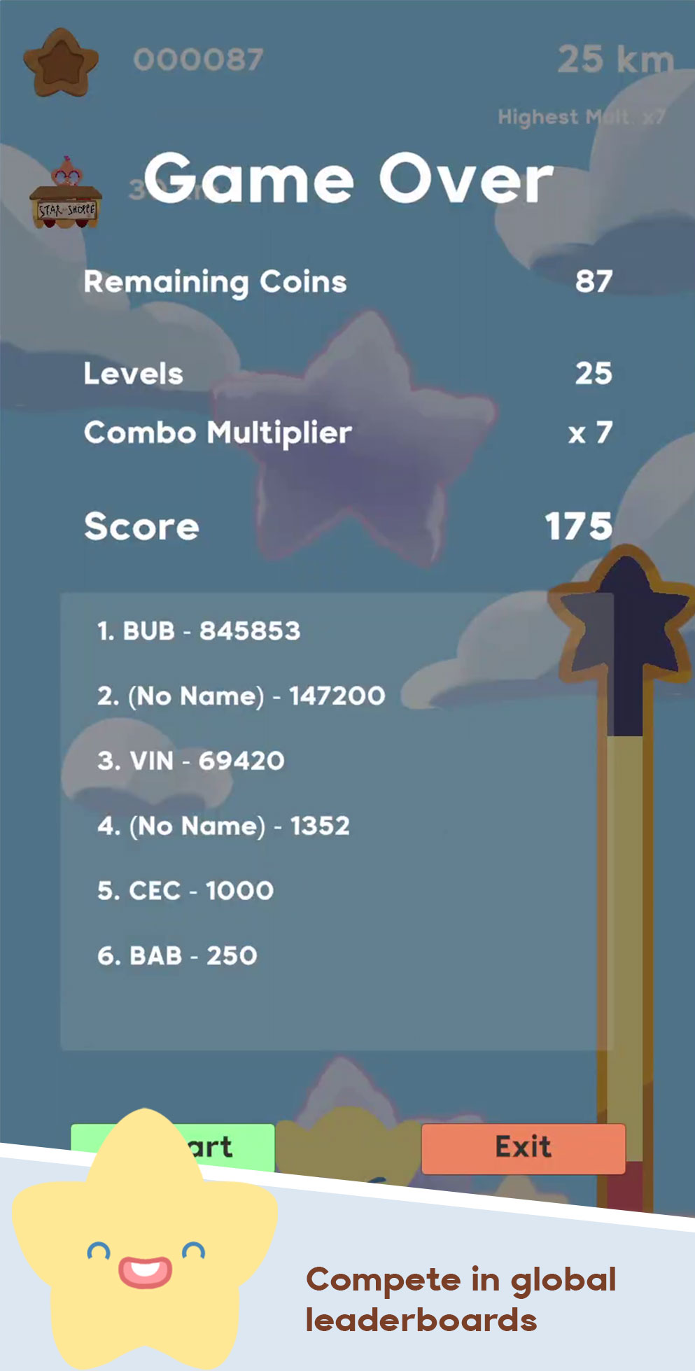 Some of the people here even exceeded my expectations of a high score. Thank you for playing anyways, hope you make it one day!