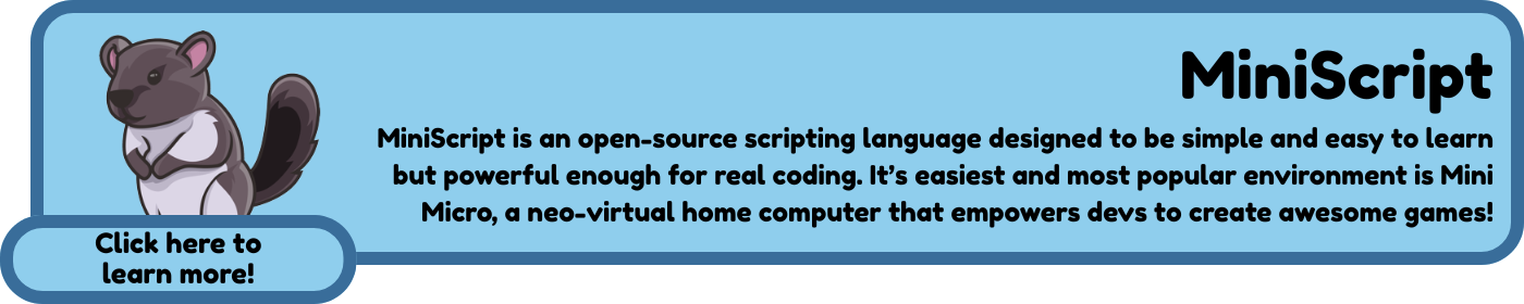 Be sure to add the tag #miniscript in your itch.io page as well as joining our Discord community to let us know you've used MiniScript.