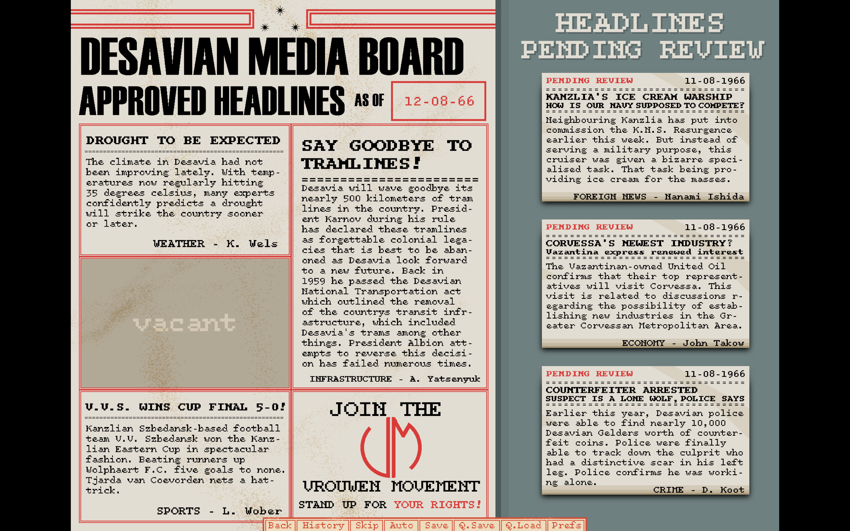 Sebenarnya dalam konsepsi inisial emang lebih berkonsekuensi sih decision2 sortir headline, namun akhirnya saya memutuskan untuk di sederhanain karena bakal memakan banyak waktu untuk tulis dan kodenya lg (kode renpy d66 itu emang agak lain).