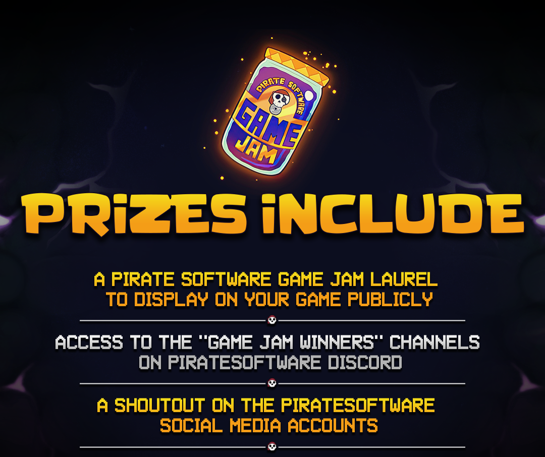 A Game Jam is a short event where you and others work together to create a small game. Most Jams have some kind of restriction on theme or style to get you thinking about games in a new way. Game Jams are a great way to test ideas, build on your skills, and meet other awesome creative people. Do them. Future you will thank you for it. Pirate Software runs Game Jams two times a year and all of our jams have prizes!