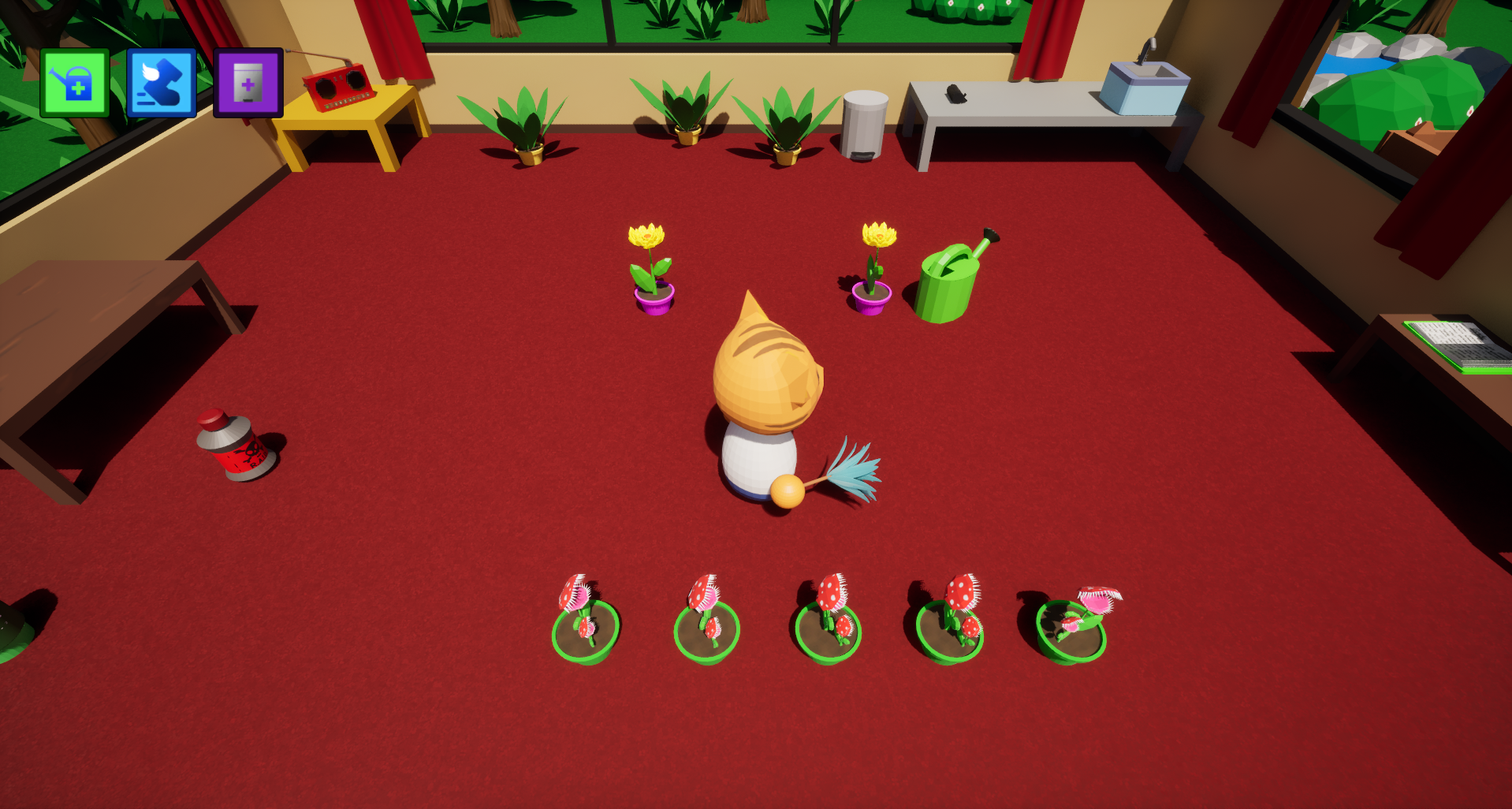 Nice cozy game about caring for plants! I've also been blasted by some intense music which scared me a bit :D. I like the aspect of having to place plants in specific places for right light levels and all other management for plant needs. I like the cute artstyle though it would be better if everything had consistent shading style (as in just just changing shading to smooth on things like player model though that might just be my opinion). Overall really nice game. Good work! (Also at some point I think my watering can disappeared somehow).