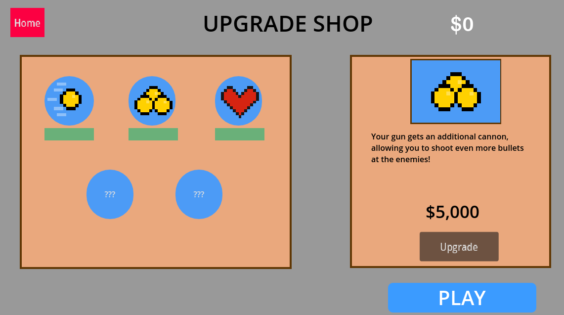 Fun play, the game loop is there. I like the ideas of the upgrades and I think you should definitely add more unique mechanical upgrades. Another optional suggestion is allow the player to shoot with arrow keys? It might be just me but I feel like this game could play nicely without a mouse. Overall, great job on your first game and keep up the good work!
