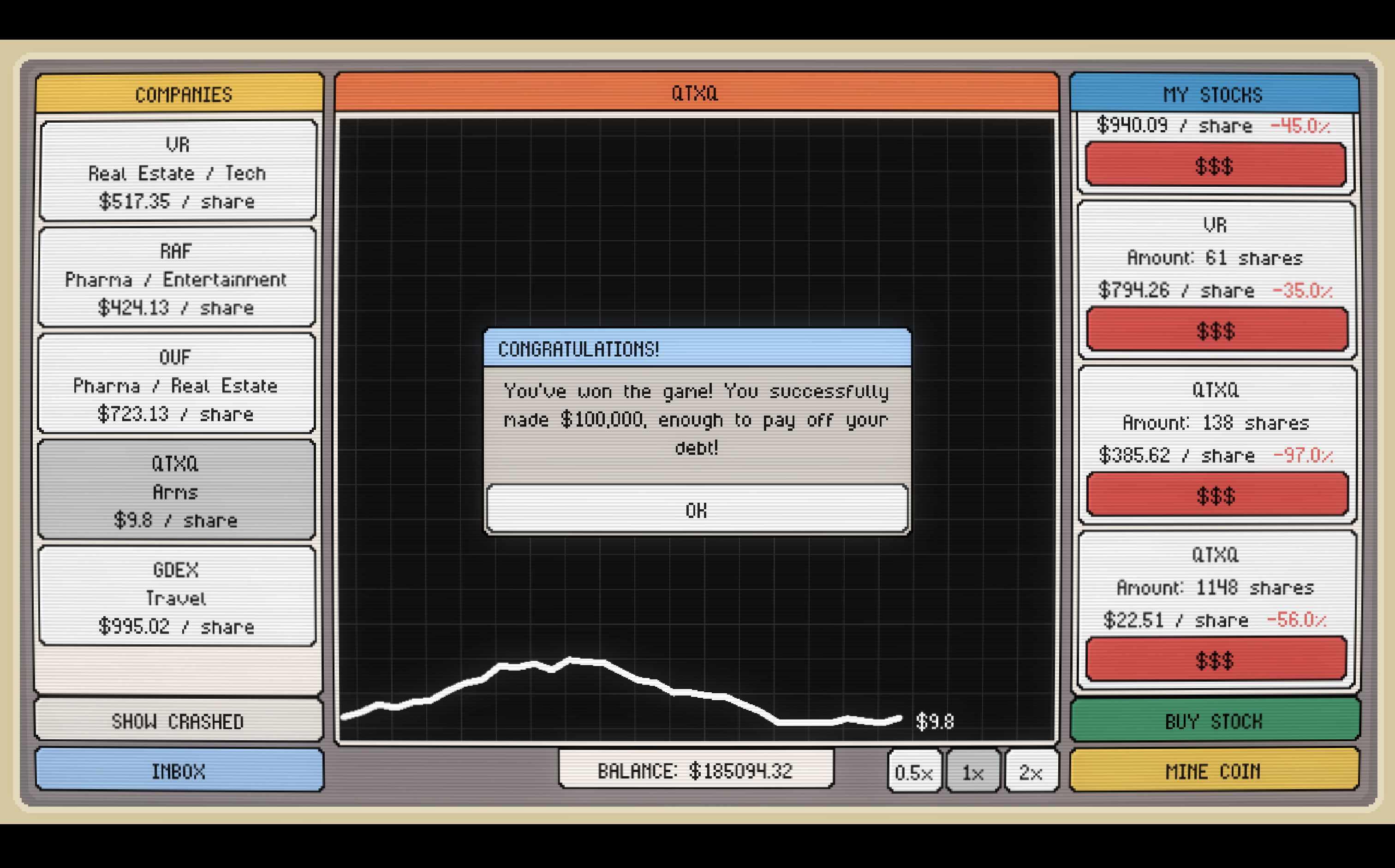 It probably goes against the gameplay loop you want, but it would be cool to set buy/sell limits (that might push it into more of an auto game than a clicker game though)