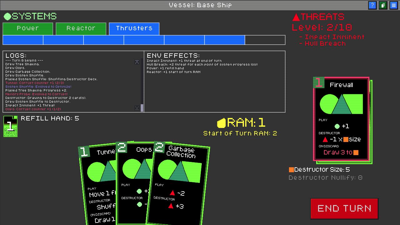 Very interesting game! I'll play a few more runs. The current run got unresponsive, I can't click anything but the Escape key brings the options menu. After clicking END TURN, the card activated by the destructor got corrupted, activated its corrupted effect and couldn't click anything else.