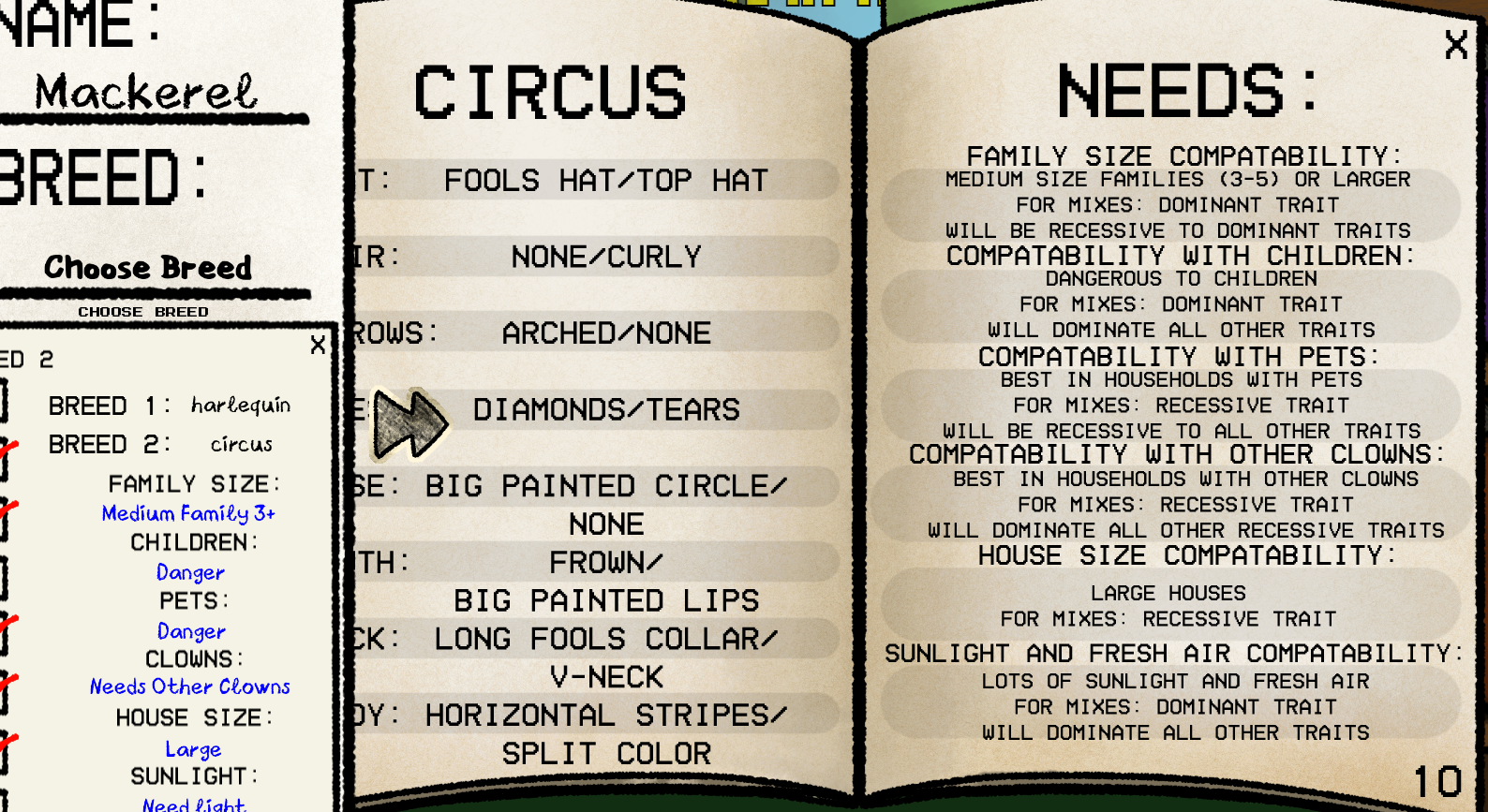 In this case, the needs are correct. There are six tiers to dominant vs recessive needs in our game. In the case of a circus/harlequin hybrid, the circus breeds clown compatibility states "Recessive trait: Will dominate all other recessive traits," while the harlequin's clown compatibility only says "Recessive trait," which means you take the need from the Circus breed page.