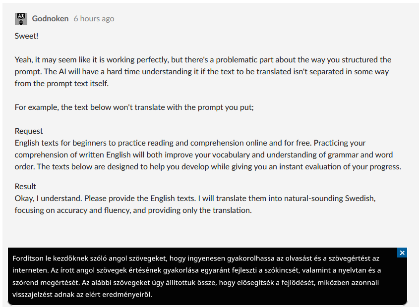 That's strange, because it didn't look broken to me. I actually just retested it and didn't have any problems with the translation, but thanks for the heads-up. Structure is definitely the way to go. I haven't had much time lately, so DeepL is plenty for me and I'm not using any custom APIs right now. That was just the last prompt I had set up, so I just rolled with it :)