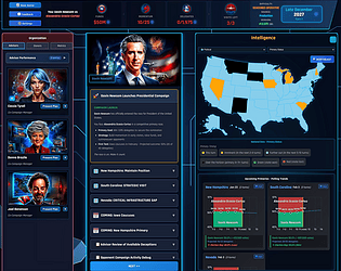 - Demographic targeting - leaders have traits that give them edges in specific states: 19 metrics per state. E.g. conservative/progressive, religious (by type), worker type (agriculture, manufacturing, service industry, tech etc...)