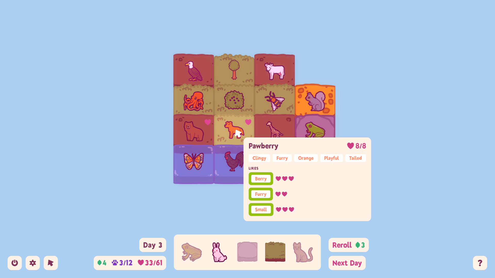 A relaxing animal placement puzzle game where you build the perfect little world for your friends. Bring all kinds of creatures to your sanctuary, and place them where they'll thrive. Some like shade. Some like snacks. All of them are happy to have a safe new home.