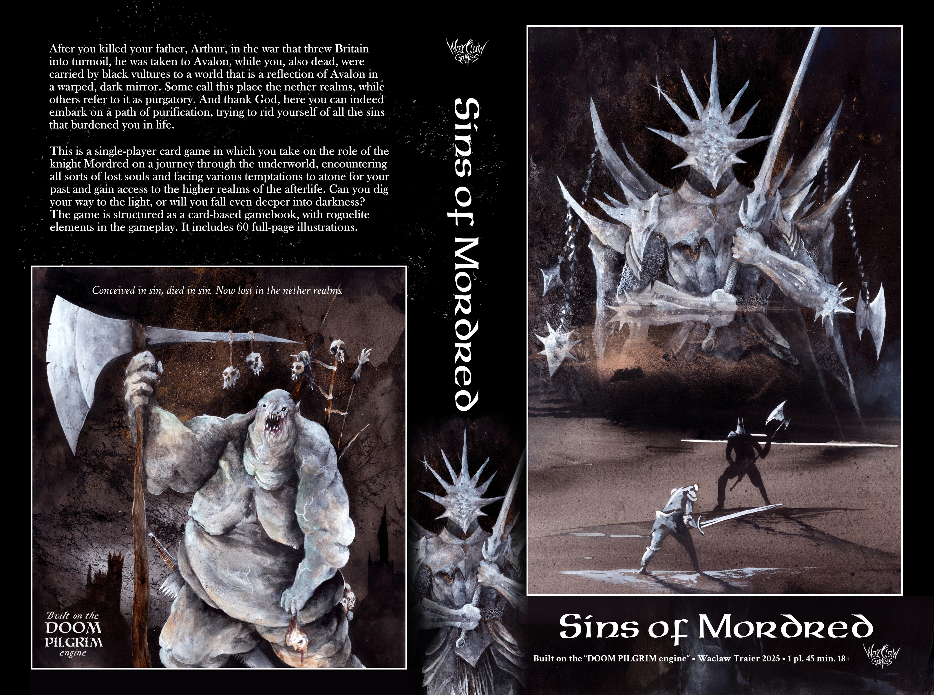 Hey folks, I would like to introduce my solo adventure card game to you. It is a dark fantasy game inspired by the Excalibur movie and the Dark Souls series. It uses 60 big cards with illustrations on one side and text on the other side, and it uses the mechanics of my older game, Doom Pilgrim. If you are into Arthurian myths or grimdark stuff in general, I will be glad if you check it out on the link here: