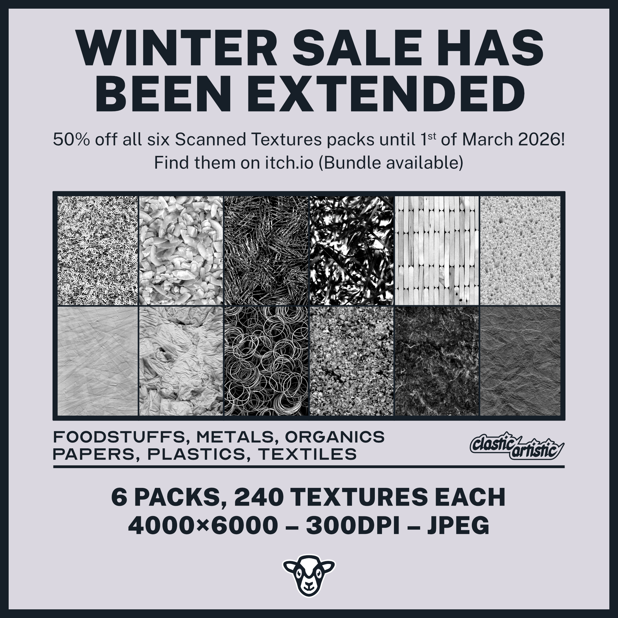 50% off all Scanned Texture packs till the end of the 1st of March GMT! Available as a bundle on itchio!