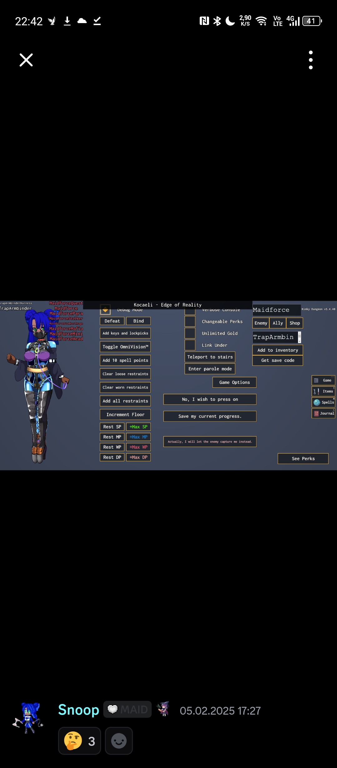 I've been playing for a bit. My girl managed to get herself into some pretty nasty scrapes, but managed to wiggle out of enough to keep going. Now, though, she's taken too mach to ever likely escape from. Is it worth continuing? Is there a lose state? Any indication of when she's too far gone? Or do you just keep playing until you choose to abandon her quest and start again with a new hapless girl? It almost seems like once you're in too deep, there's pretty much nothing the badguys can do to you. Just headbutt anyone who puts a leash on you whenever you have enough stamina, and you can travel forever.
