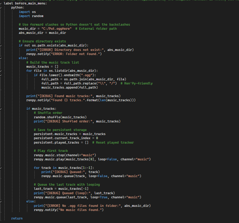 As far as by now, I've tried to develop spotify-alike features to make the BGM feels more customizable, but that is when it hit hards, cuz it is extremely hard to just trying not breaking the quene, but aslo tracking in the queue. And by any chance, will your tool is able to use the renpy queue? Yea it sounds dumb but because I've scramble this game code and spot that it onlys untilize renpy.music.queue/play as the devs probably don't want to makes it harsh to code.
